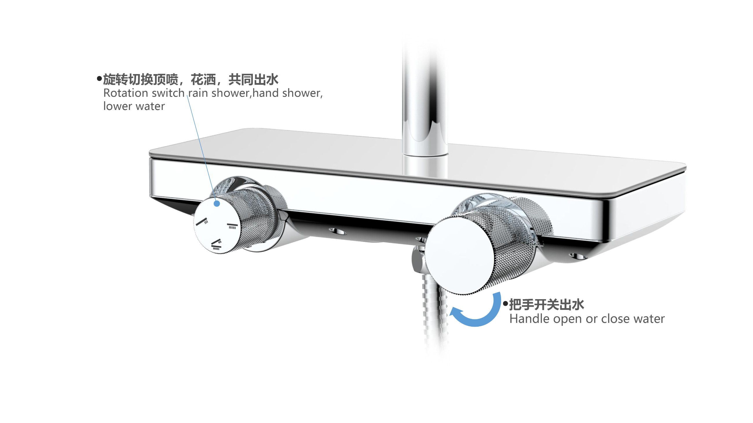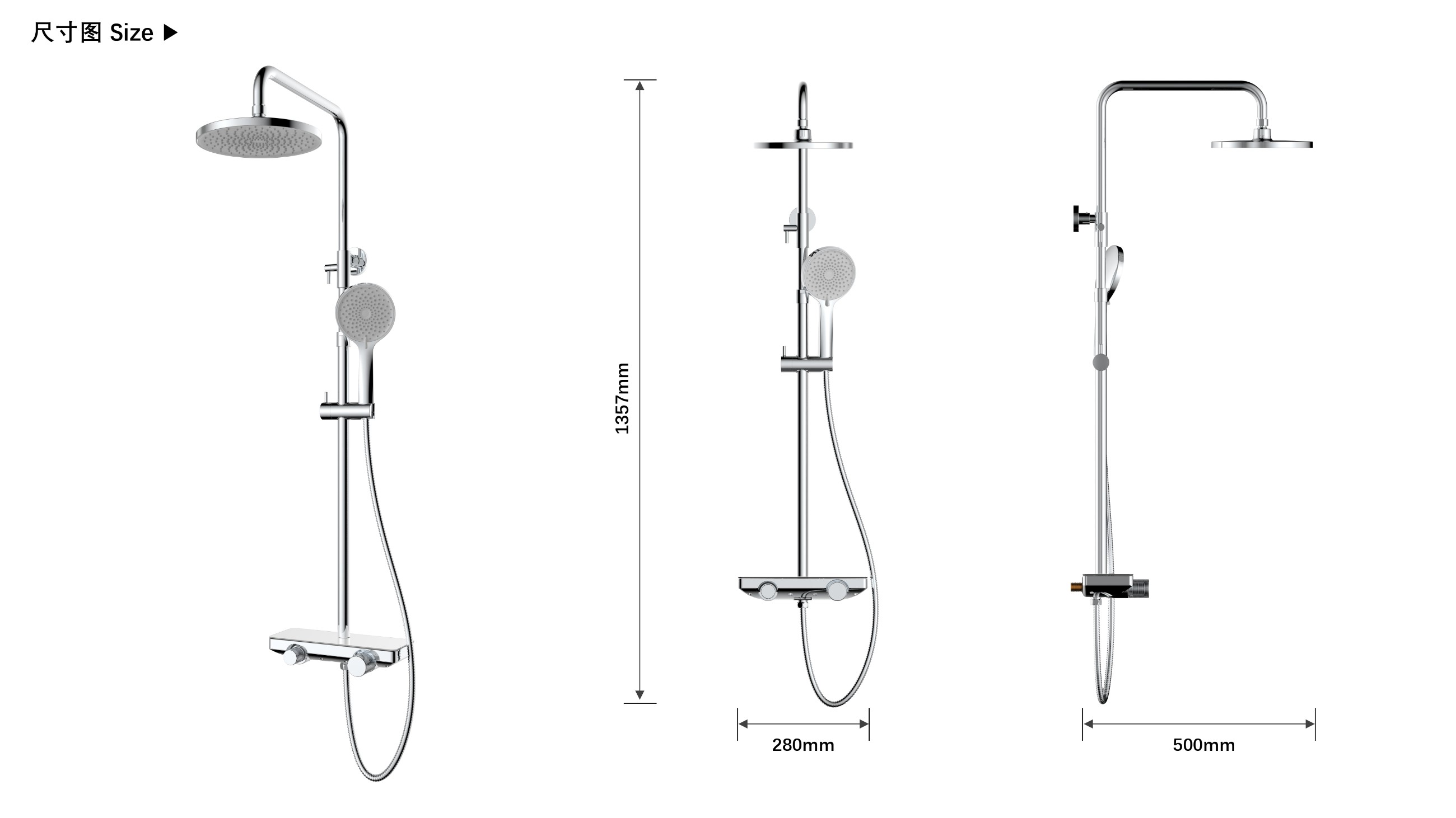 至美星空花灑;寬大置物面板放置洗護(hù)用品;旋轉(zhuǎn)切換頂噴/花灑/下出水